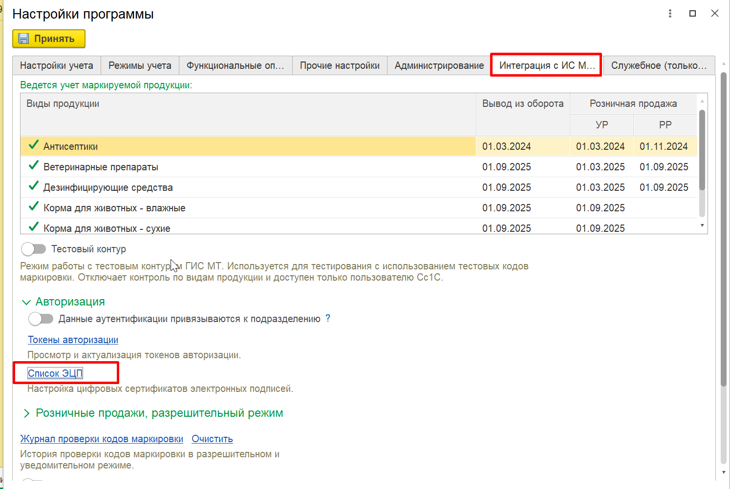Открываем Енот с учетной записи с полными правами с рабочего места, где установлен КриптоПро. Заходим в раздел Настройки — Настройки программы — открываем вкладку Интеграция с ИС МП (Честный знак).