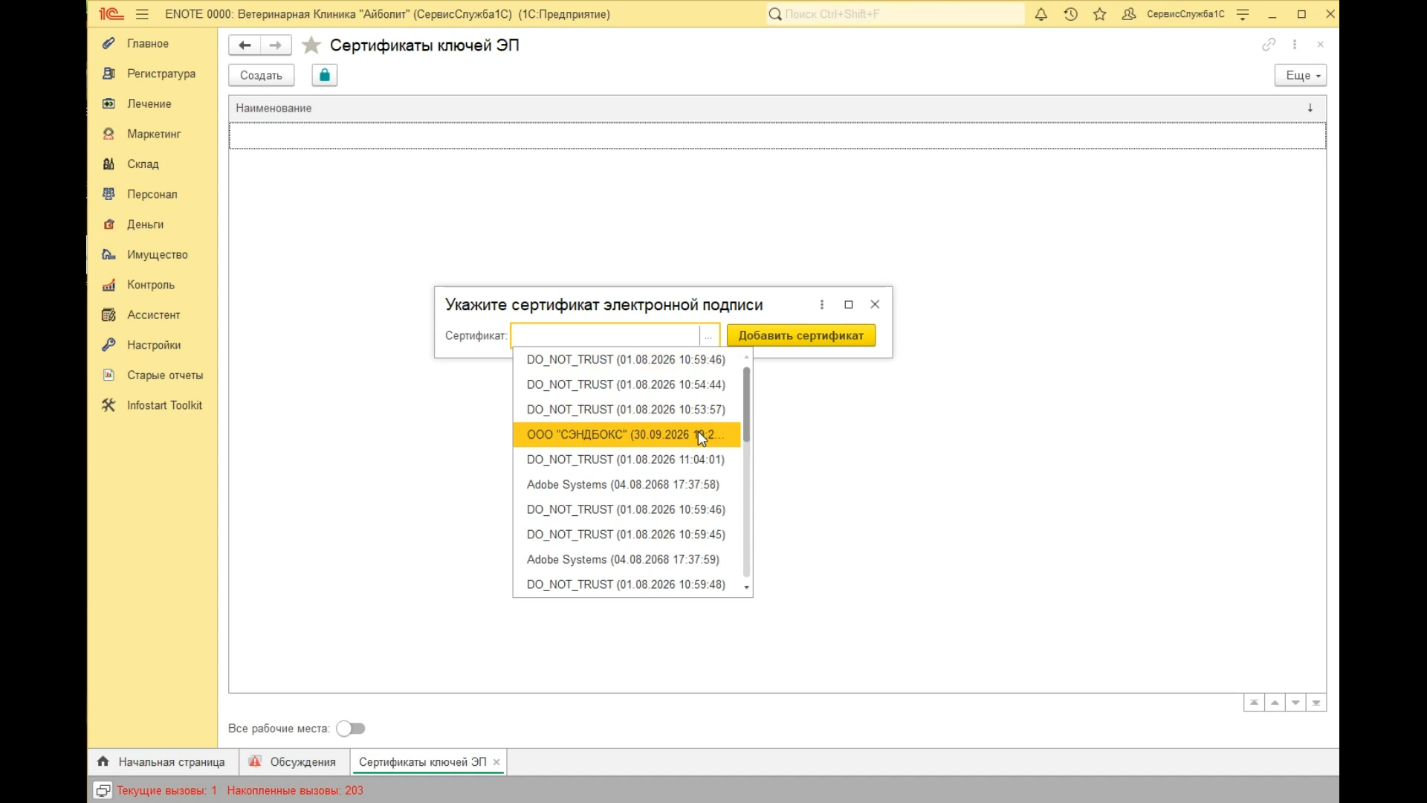 В открывшемся окне нажимаем на кнопку Создать, выбираем нужный сертификат КриптоПро из выпадающего списка и нажимаем на кнопку Добавить сертификат