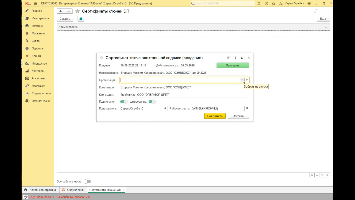 Указываем, к какой организации в Еноте принадлежит сертификат. Вся остальная информация заполнится автоматически из данных сертификата.
