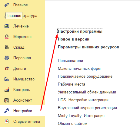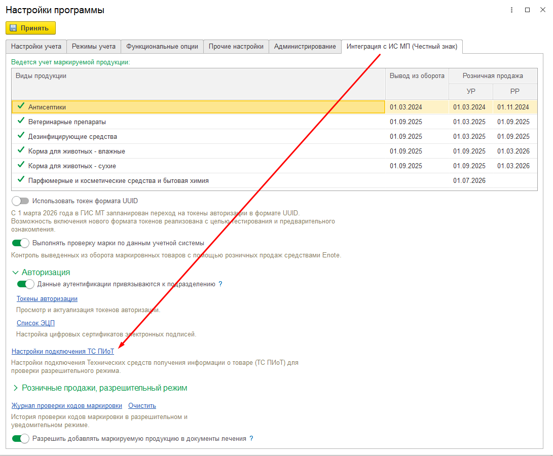 Настройки – Настройки программы – Интеграция с ИС МП (Честный знак) Перейдите по ссылке «Настройки подключения ТС ПИоТ»
