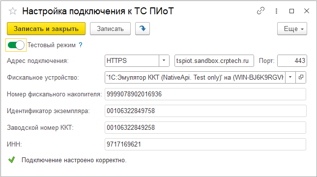 При успешном завершении настройки выводится соответствующее сообщение. В случае успешного подключения к ТС ПИоТ в программу поступают реквизиты кассового аппарата: