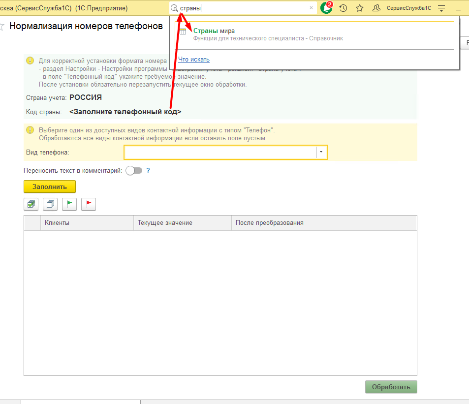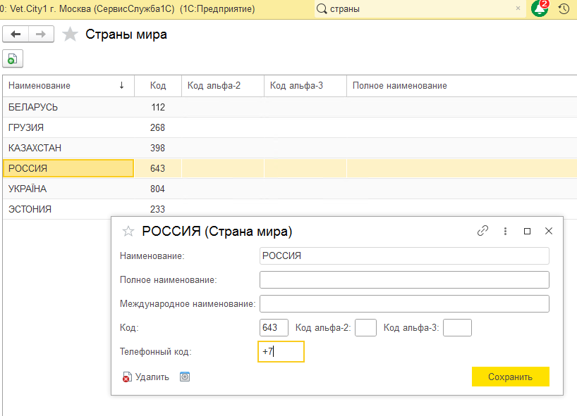 - Проверьте код страны. Если он не заполнен, в строке поиска введите Страны мира и откройте найденный справочник.