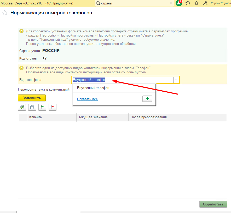 - В открывшемся списке выберите нужную страну, заполните поле Телефонный код и сохраните изменения. После этого повторно откройте механизм нормализации номеров.