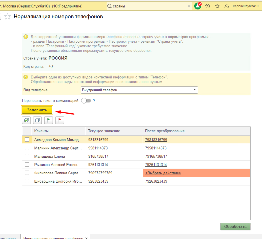 - Нажмите кнопку Заполнить. Система выполнит поиск номеров, подходящих для нормализации, и отобразит их в таблице.