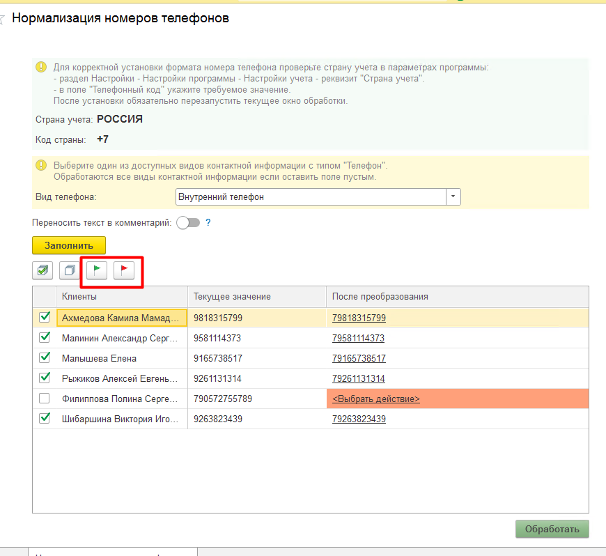 - На панели таблицы доступны кнопки массовой отметки. Зеленый флаг — отметить строки с корректно определенными номерами; Красный флаг — отметить строки, по которым нужна ручная корректировка.
