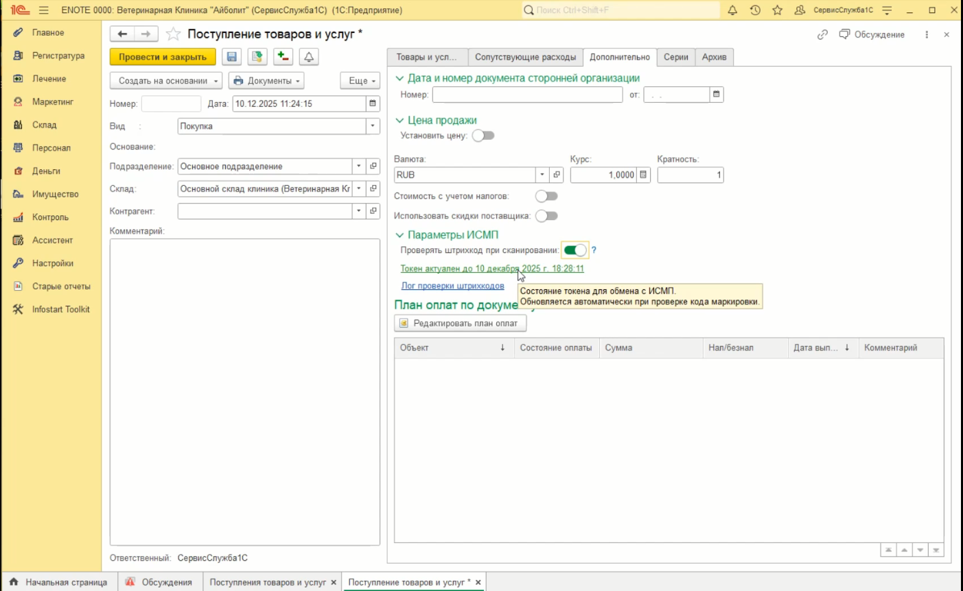 Срок действия токена — 10 часов. Информация о нем опубликована в разделе Интеграция с ИС МП в настройках программы.