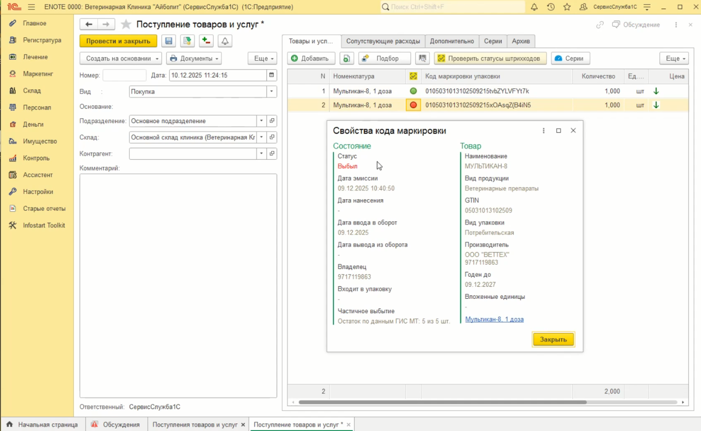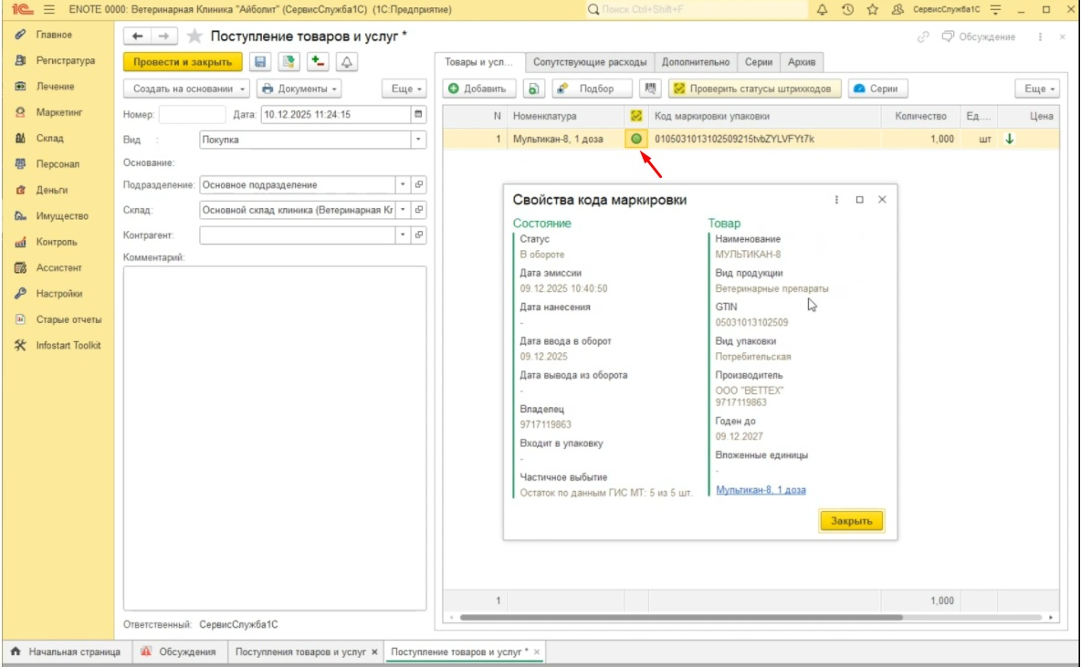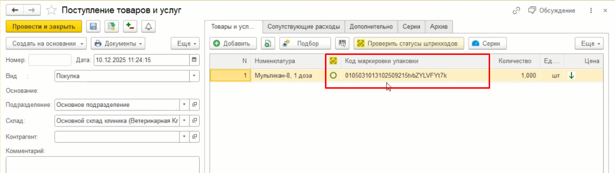В табличной части документа поступления товаров мы добавили 2 колонки: код маркировки упаковки и статус проверки марки. Также добавили кнопку Проверка кодов маркировки.