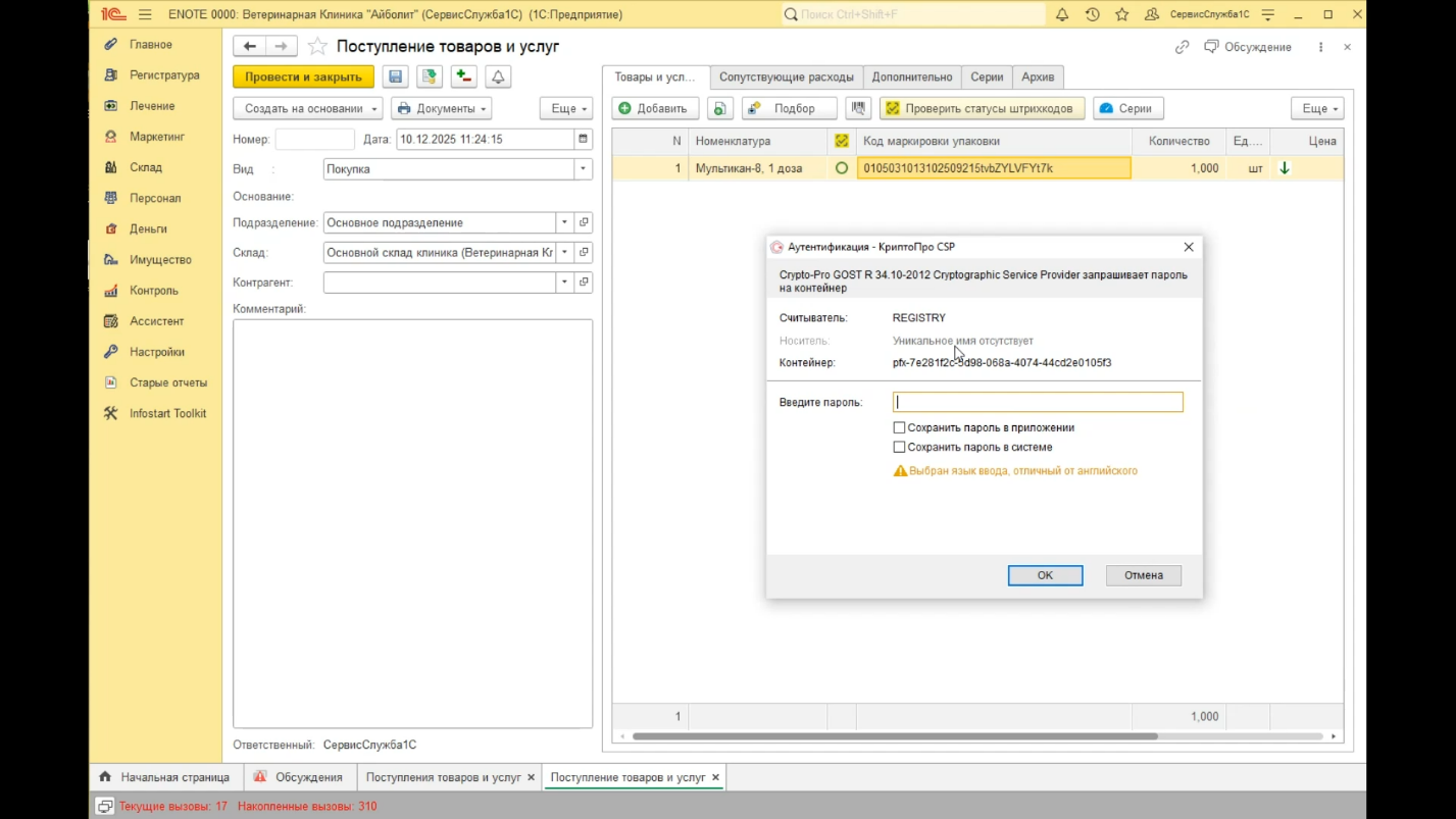 Чтобы проверить марку в документе поступления, нужно добавить ее в таблицу, отсканировав дата-матрикс код с упаковки.